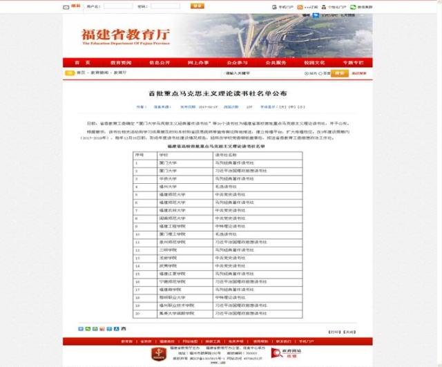 近日,福建省委教育工委公布了福建省高校首批重點(diǎn)馬克思主義理論讀書社名單,全省高校共20個(gè)讀書社入圍,我院“習(xí)近平治國(guó)理政思想讀書社”名列其中。