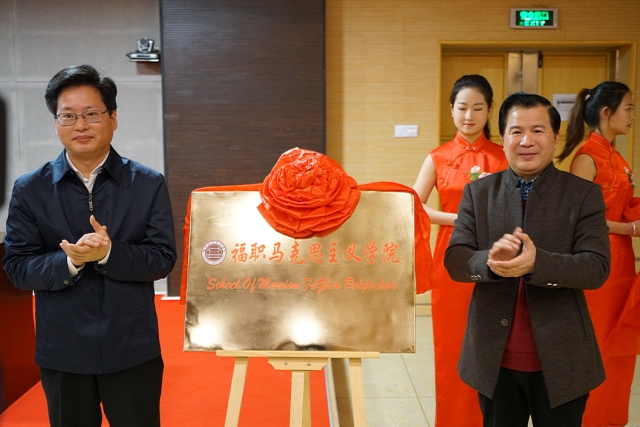陳承茂書記代表學(xué)校對(duì)出席揭牌儀式的各位領(lǐng)導(dǎo)、來賓和老師表示歡迎和感謝。他指出,成立福職馬克思主義學(xué)院是院黨委圍繞“立什么德、樹什么人”、“辦什么樣的大學(xué)、怎樣辦好大學(xué)”這兩個(gè)根本問題作出的重大決策,也是學(xué)校深入貫徹中宣部、教育部《關(guān)于加強(qiáng)馬克思主義學(xué)院建設(shè)的意見》和《高等學(xué)校思想政治理論課建設(shè)標(biāo)準(zhǔn)》的具體舉措。在新的形勢(shì)和挑戰(zhàn)面前,福職馬克思主義學(xué)院科研和教學(xué)要強(qiáng)起來,必須要以研促教,教研相長,打造馬克思主義理論研究的重要基地,構(gòu)建高水平馬克思主義理論學(xué)科,形成高質(zhì)量理論研究成果。