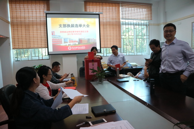 2017年10月25日上午,思想政治理論教學研究部黨支部根據(jù)校黨委關(guān)于基層黨組織換屆選舉工作的有關(guān)部署,經(jīng)校黨委批準,在學院會議室召開了中共福州職業(yè)技術(shù)學院思想政治理論教學研究部支部委員會黨員大會。大會由劉思鍶老師主持,全體黨員參加了大會。