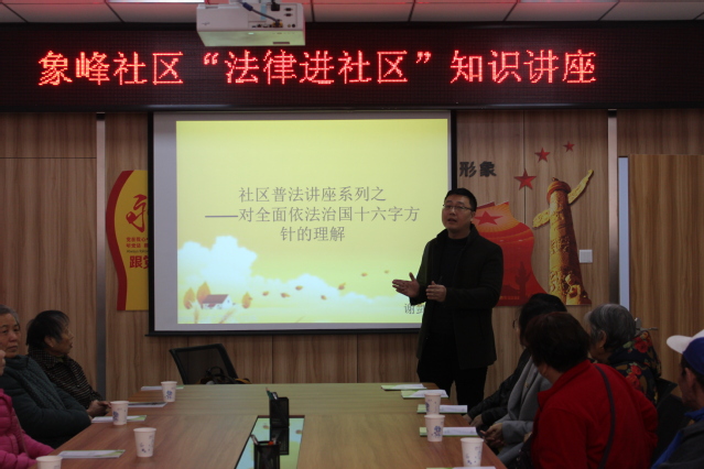 在十九大報告中,“堅持全面依法治國”,被明確作為十四條新時代堅持和發(fā)展中國特色社會主義的基本方略之一。為進一步貫徹全面依法治國理念,深入學習宣傳憲法等法律知識,大力弘揚法治精神,提高群眾知法、懂法、守法、用法的意識。2017年12月26日上午,由福州職業(yè)技術學院馬克思主義學院聯(lián)合福州市社區(qū)大學開展的“法律進社區(qū)”普法活動在福州市晉安區(qū)象峰社區(qū)如火如荼地開展。馬克思主義學院謝劍輝老師為社區(qū)居民做了一次別開生面的普法知識講座。