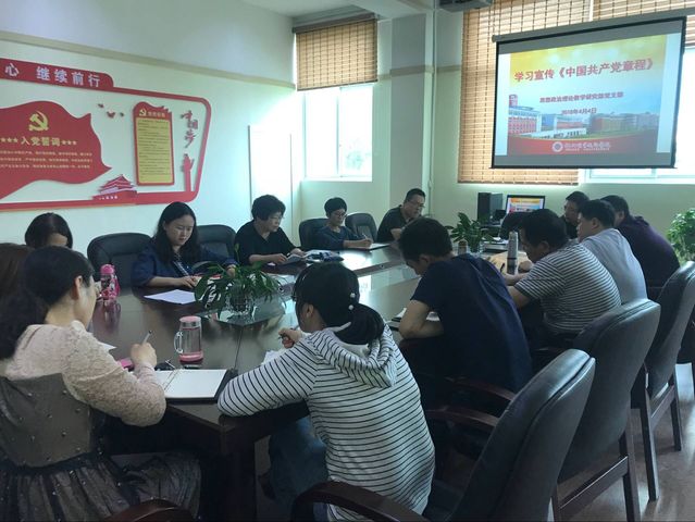 2018年4月4日,學(xué)院黨支部在會(huì)議室組織召開學(xué)習(xí)宣傳《中國(guó)共產(chǎn)黨章程》黨員大會(huì),全體教職工黨員參加,會(huì)議由黨支部書記陸芳教授主持,她指出認(rèn)真學(xué)習(xí)黨章,嚴(yán)格遵守黨章,是每一位黨員應(yīng)盡的義務(wù)和莊嚴(yán)的責(zé)任,也是深入學(xué)習(xí)貫徹黨的十九大精神的重要組成部分。她強(qiáng)調(diào)全體黨員老師要認(rèn)真學(xué)習(xí)黨章、遵守黨章、貫徹黨章、維護(hù)黨章,切實(shí)增強(qiáng)“四個(gè)意識(shí)”,堅(jiān)定“四個(gè)自信”,做到“兩個(gè)維護(hù)”,牢固樹立黨章意識(shí),進(jìn)一步提高黨性修養(yǎng),不忘初心,勠力前行,把黨章各項(xiàng)規(guī)定落實(shí)到黨員的具體行動(dòng)上,落實(shí)到推動(dòng)學(xué)校科學(xué)發(fā)展上。