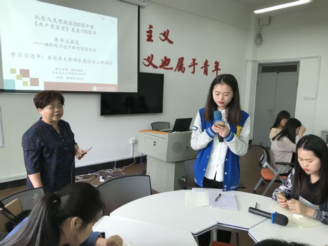 全體同學以“接力”的方式,認真朗讀了《習近平在北京大學師生座談會上的講話》,并且結合當天上午習近平總書記發(fā)表的《在紀念馬克思誕辰200周年大會上的講話》暢所欲言、交流思想、相互啟發(fā),深刻領會總書記對青年學生提出的“四個要”和“四個希望”,發(fā)自內心說出他們的青春理想。