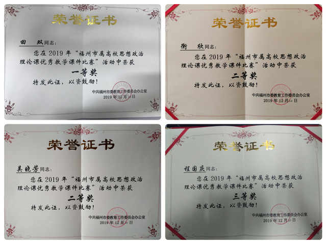 日前,中共福州市委教育工作委員會公布了2019年福州市屬高校思政課優(yōu)秀教學(xué)課件征集活動的評審結(jié)果,我校共有4位思政課教師參加并全部獲獎!其中,田雙老師獲得一等獎,衡欣老師、吳曉芳老師獲得二等獎,程國慶老師獲得三等獎。