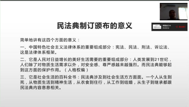 為深入學(xué)習(xí)貫徹習(xí)近平總書記重要講話精神,充分認(rèn)識(shí)頒布實(shí)施《民法典》的重大意義,熟讀這部涉及社會(huì)和經(jīng)濟(jì)生活方方面面的“百科全書”,2020年6月24日,馬克思主義學(xué)院開(kāi)設(shè)空中法律講壇,由張章盛副教授專題解讀《民法典》基礎(chǔ)知識(shí)。馬克思主義學(xué)院、機(jī)器人學(xué)院、文化創(chuàng)意學(xué)院、特殊教育學(xué)院全體教職員工、馬院習(xí)近平新時(shí)代中國(guó)特色社會(huì)主義思想讀書社成員等近100人參加了專題講座。