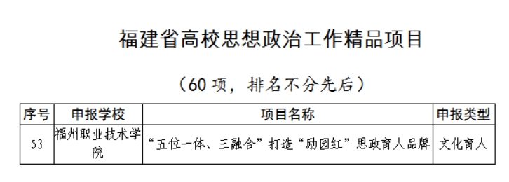 近日,中共福建省委教育工委公布了2021年福建省高校思想政治工作精品項(xiàng)目入選名單,我校馬克思主義學(xué)院和宣傳部聯(lián)合申報(bào)的文化育人項(xiàng)目《“五位一體、三融合”打造“勵(lì)園紅”思政育人品牌》入選福建省2021年高校思想政治工作精品項(xiàng)目。
