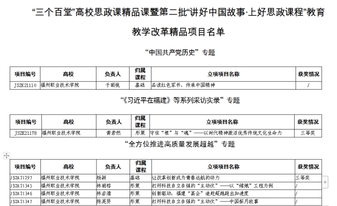 近日,中共福建省委教育工委關(guān)于公布“三個(gè)百堂”高校思想政治理論課精品課遴選結(jié)果的通知(閩委教思〔2021〕29號(hào)),我院六個(gè)項(xiàng)目榮獲“三個(gè)百堂”高校思想政治理論課精品課暨第二批“講好中國(guó)故事·上好思政課程”教育教學(xué)改革精品項(xiàng)目立項(xiàng),其中楊穎、黃若然項(xiàng)目榮獲三等獎(jiǎng)。