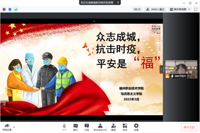 3月23日晚,由學(xué)校宣傳統(tǒng)戰(zhàn)部、馬克思主義學(xué)院共同舉辦的《眾志成城、抗擊時(shí)疫、平安是“?!薄穼n}思政課在線上開講,近三千名師生齊聚云端、認(rèn)真聆聽馬克思主義學(xué)院吳曉芳老師講述福建“戰(zhàn)疫”故事,同上了一堂鮮活生動(dòng)的“大思政課”。