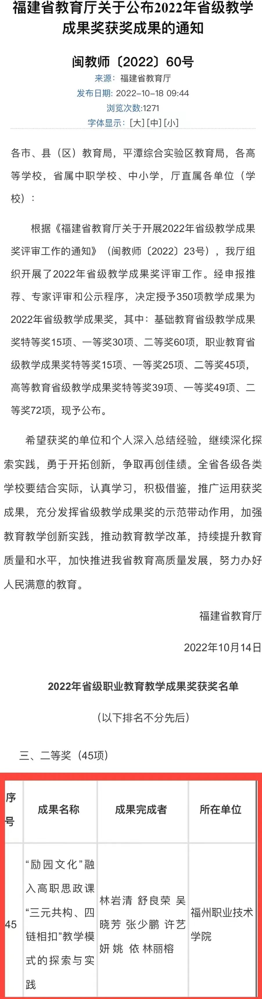 日前,省教育廳印發(fā)《關于公布2022年省級教學成果獎獲獎成果的通知》。經(jīng)申報推薦、專家評審和公示程序,福州職業(yè)技術學院馬克思主義學院申報的《“勵園文化”融入高職思政課“三元共構、四鏈相扣”教學模式的探索與實踐》教學成果榮獲2022年省級職業(yè)教育教學成果獎二等獎(團隊成員:林巖清、舒良榮、吳曉芳、張少鵬、許藝妍、姚依、林麗榕)。