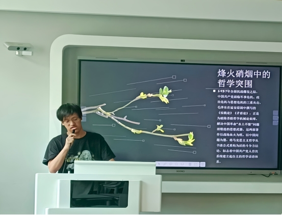 活動(dòng)中,實(shí)踐部的朱穎同學(xué)分享了毛澤東的經(jīng)典詩(shī)詞《七律?長(zhǎng)征》,用生動(dòng)的語(yǔ)言描繪了紅軍戰(zhàn)士在長(zhǎng)征途中跨越千山萬(wàn)水的艱難險(xiǎn)阻,展現(xiàn)出他們堅(jiān)韌不拔的意志和英勇無(wú)畏的革命精神;秘書部的鄭金杰同學(xué)詳細(xì)闡述了《毛澤東選集》中蘊(yùn)含的深邃思想是如何在特定的歷史背景下形成與發(fā)展的;宣傳部的黃冬燕同學(xué)則以《星星之火,可以燎原》為例,通過(guò)詳實(shí)的歷史資料和清晰的邏輯講解,讓同學(xué)們明白了在革命最艱難的時(shí)期,毛澤東同志如何以敏銳的洞察力和堅(jiān)定的信念,為中國(guó)革命指明了前進(jìn)的方向,讓星星之火終成燎原之勢(shì)。