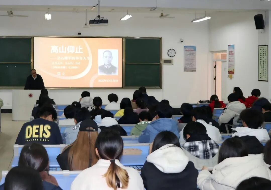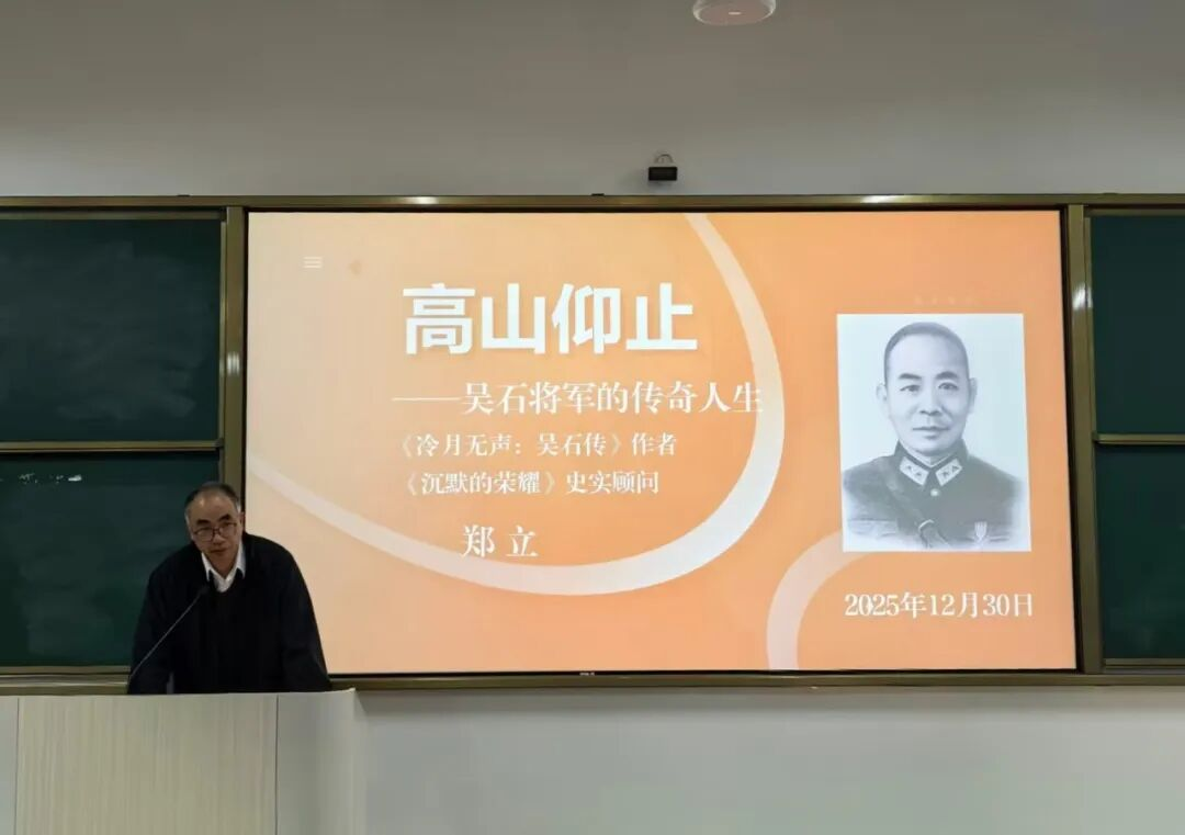 之后,鄭立老師進(jìn)行《高山仰止——吳石將軍的傳奇人生》專題講座。鄭立老師深耕吳石烈士研究多年,著有《冷月無聲——吳石傳》等權(quán)威著作。他以深厚的鄉(xiāng)梓情懷和嚴(yán)謹(jǐn)?shù)氖穼W(xué)視角,將“英雄福州城 血性福州人”的主題貫穿始終,深情講述了吳石將軍作為福州兒女的卓越代表,其波瀾壯闊的一生。講座不僅詳述了吳石將軍在抗戰(zhàn)與解放事業(yè)中的不朽功勛與英雄壯舉,也講述了與之并肩的陳寶倉將軍以及福州籍烈士聶曦等人的家國情懷。這段與福州緊密相連的塵封歷史,因真實(shí)而格外震撼,令師生對這片土地所承載的英雄傳統(tǒng),產(chǎn)生了強(qiáng)烈的認(rèn)同與自豪。