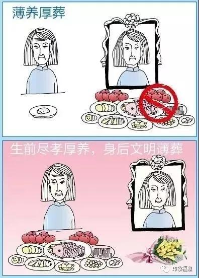 崇尚厚養(yǎng)薄葬,對在世老人盡孝心多關(guān)心。簡化治喪儀式,不收非親人員禮金、禮物,文明禮俗,簡化喪葬程序,沿街亂搭靈堂靈棚,不在公共場所吹打鼓樂和鳴放煙花爆竹,不在出殯沿線散紙錢,用環(huán)保、生態(tài)、潔凈的方式悼念逝者。