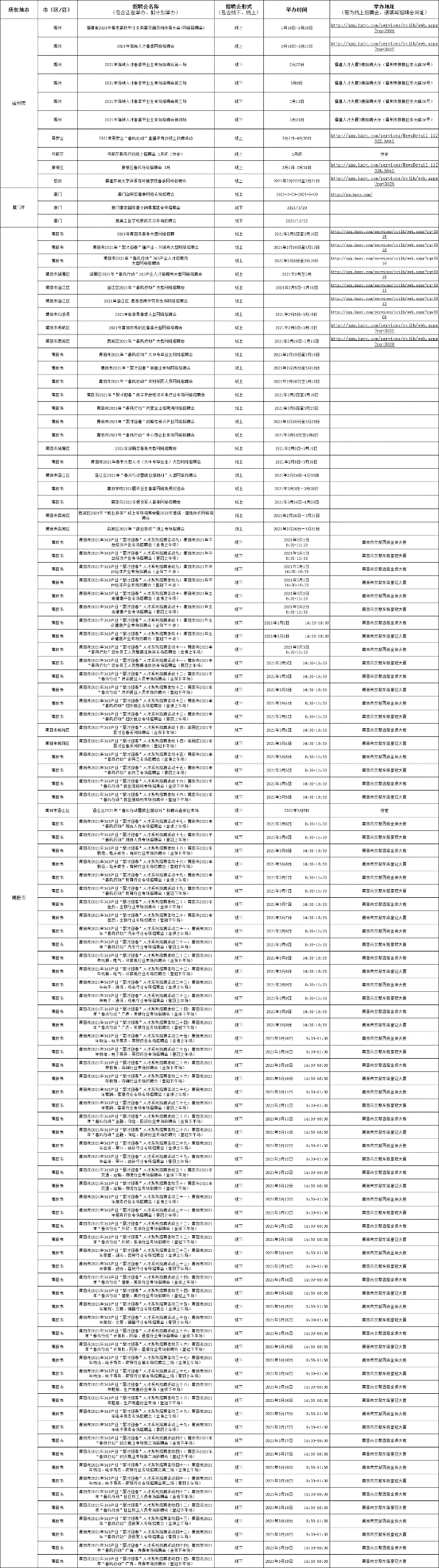 為扎實做好“六穩(wěn)”工作,全面落實“六?!比蝿?,保障節(jié)后企業(yè)用工需求,促進更充分和更高質(zhì)量就業(yè),2021年春節(jié)后開工第一天(2月18日)起,至4月30日期間,中國海峽人才市場在全省范圍內(nèi)計劃舉辦招聘會152場,其中現(xiàn)場招聘會85場,網(wǎng)絡招聘會67場。預計將有1萬多家用人單位參加招聘,提供近10萬個需求崗位。具體請點擊以下圖片查看(圖片可點擊放大):