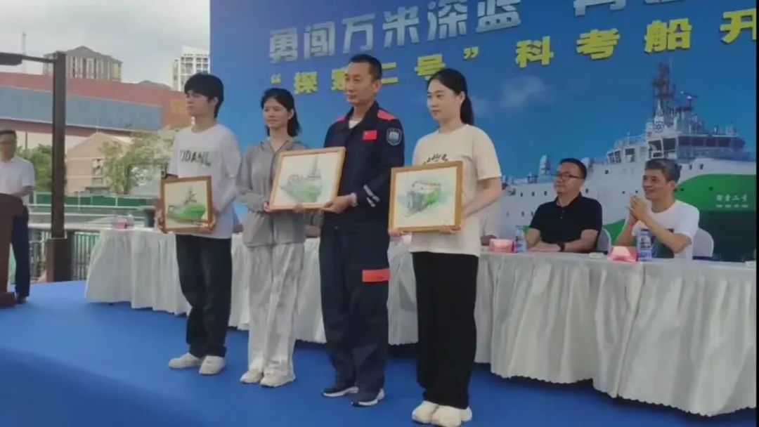 6月24日,“探索二號(hào)”科考船啟航儀式在馬尾船政博物館隆重舉行。為了向此次科考船開航表達(dá)深深的祝福和崇高的敬意,我校特教系師生在開航儀式上向“探索二號(hào)”贈(zèng)送了三幅畫作。