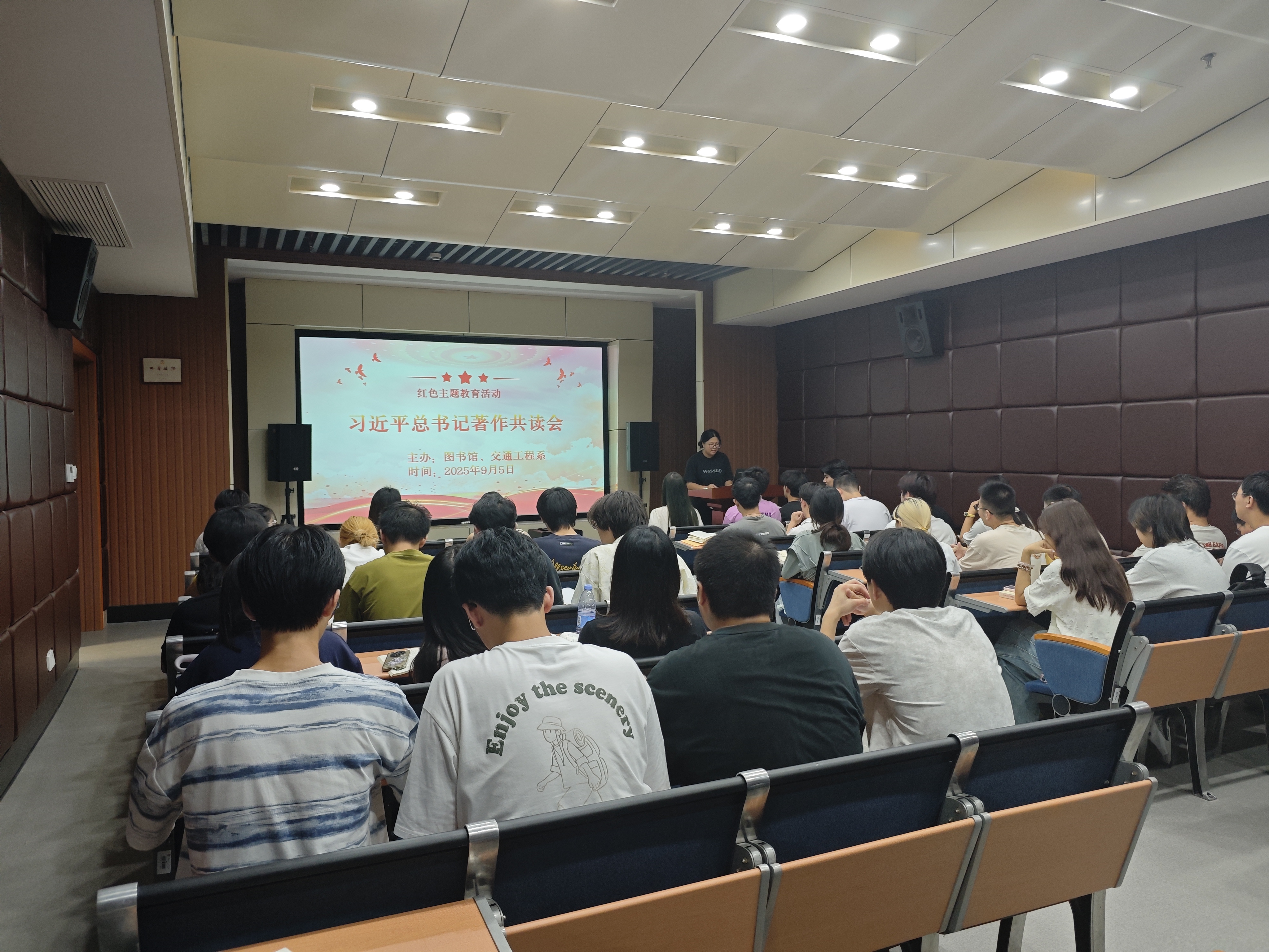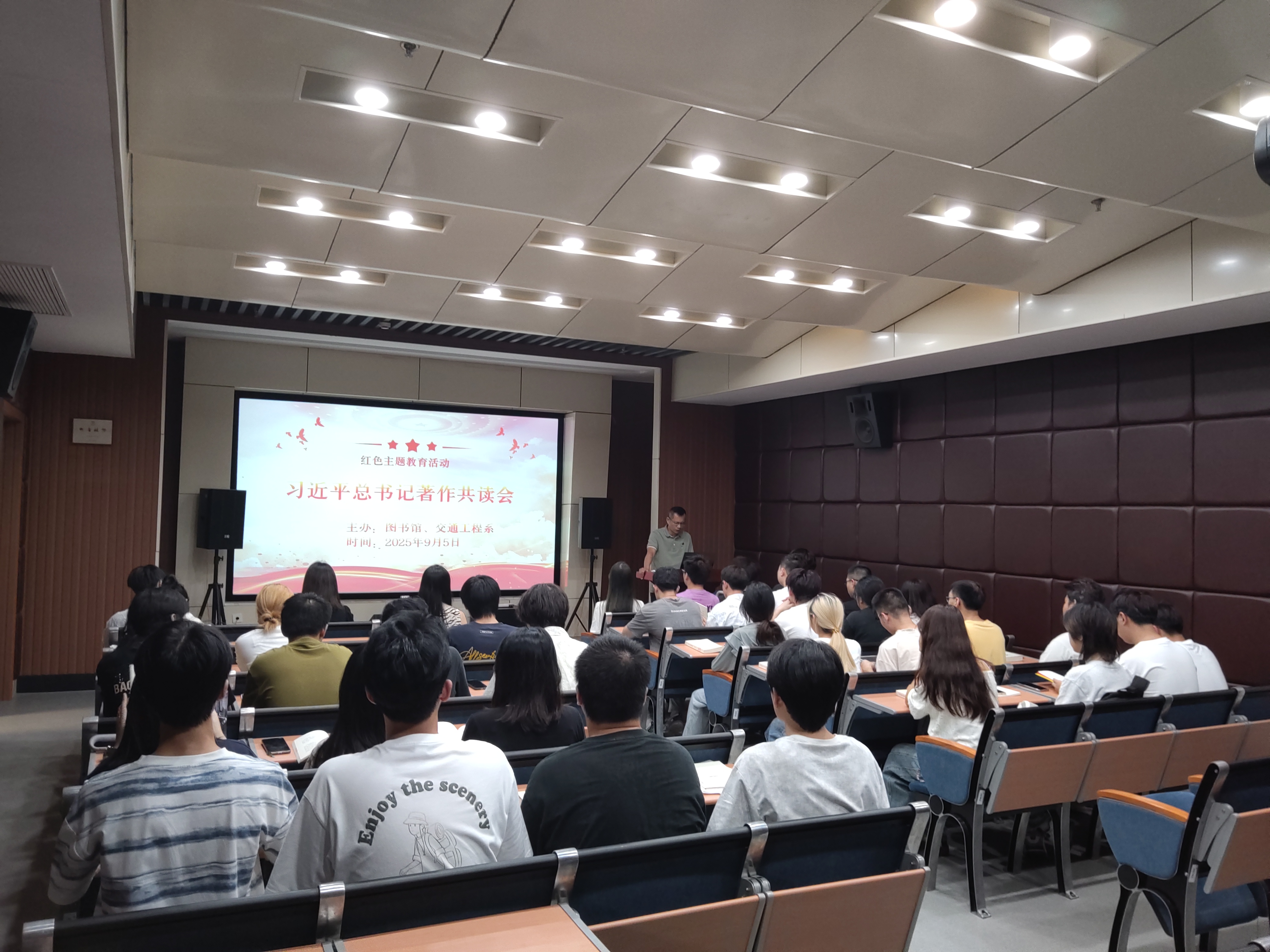 2025年9月5日下午,圖書館與校說唱社團在圖書館二層多功能廳聯(lián)合舉辦一場別開生面的紅色主題教育活動——《習近平談治國理政》師生共讀會。圖書館副館長張弼云、社團指導老師劉秀釵、陳靜及社團學生代表共57人參與了本次活動。