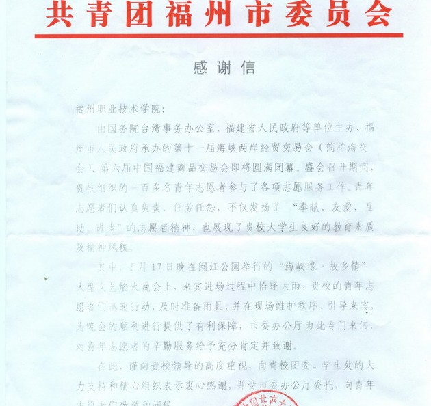 “海交會(huì)”上亮麗的風(fēng)景――市委辦公廳委托共青團(tuán)福州市委向我院青年志愿者致謝
