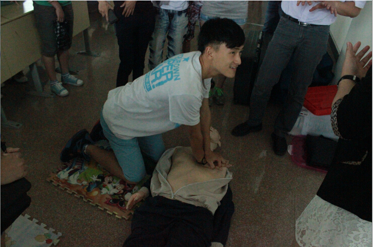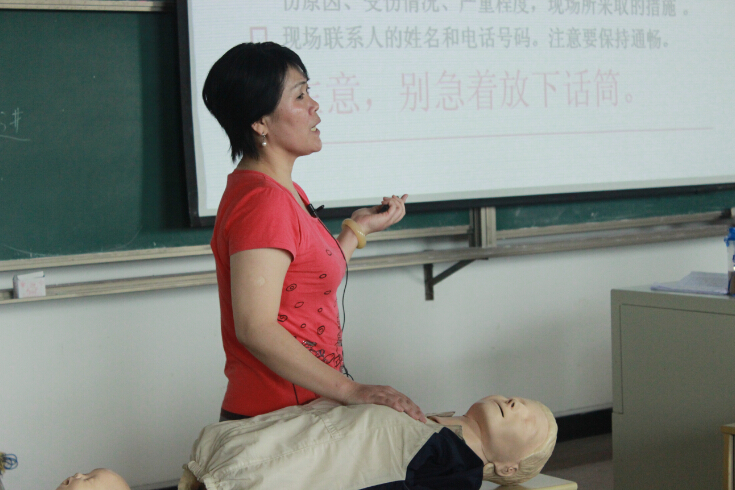魯主任首先以豐富的資料和生動的語言向同學們介紹了國際紅十字運動起源、世界紅十字日的由來和背景以及中國紅十字會宗旨、性質和職責。而后重點講解了心肺復蘇、氣道梗阻等基本自救互救常識及各種意外傷害的處理原則,并現場指導學生進行心肺復蘇操作。面對從來沒有接觸過的器具,同學們都表現出了強烈的好奇心,特別是在場的特教學生們,一個個都躍躍欲試,在紅十字會老師的指導下認真的進行操作練習。參加講座的同學們和老師紛紛表示對紅十字會組織有了新的認識,對如何進行心肺復蘇、如何抓住“黃金四分鐘”有了全面的了解,并愿意積極參加紅十字會組織的公益活動。