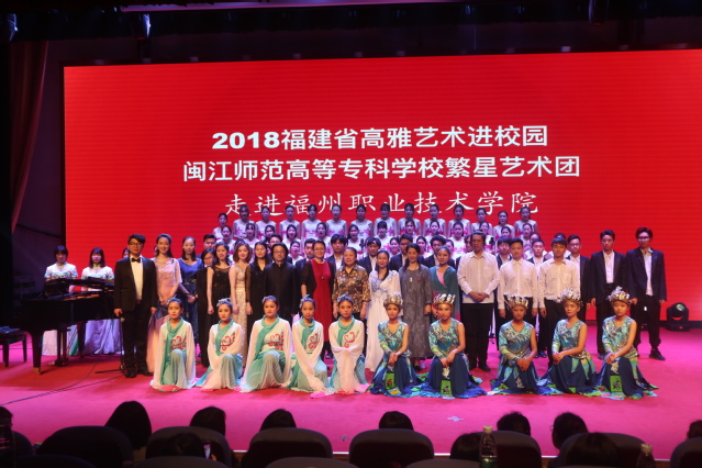 2018年4月26日,由福建省教育廳、福建省文化廳主辦的閩江師范高等??茖W校繁星藝術團走進福州職業(yè)技術學院專場演出在我校綜合樓禮堂拉開帷幕。演出現(xiàn)場座無虛席,閩江師范高等??茖W校黨委副書記陳新、我校黨委副書記沈錦華出席本次活動與500余名師生一同觀看這場精彩的文化盛宴。