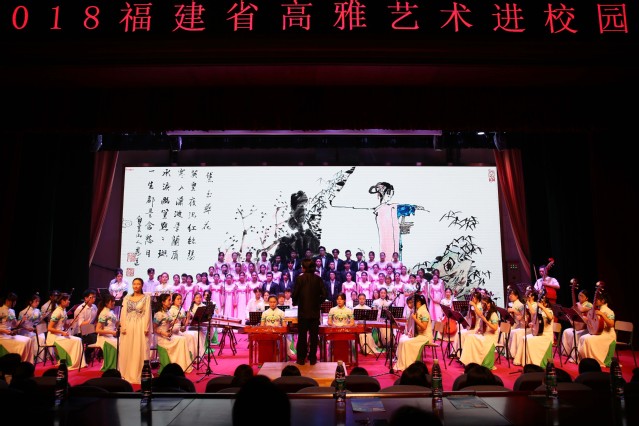 專場演出在繁星民樂團的一曲《閩都戲彩》中拉開了序幕。女高音獨唱《葬花吟》、舞蹈《采薇》、琵琶獨奏《天山之春》、男中音獨唱《一江水》、閩劇《梁祝·憶十八》等節(jié)目精彩紛呈,博得了觀眾陣陣掌聲。最后,專場演出在繁星合唱團帶來的《祖國 慈祥的母親》曲目中落下帷幕。
