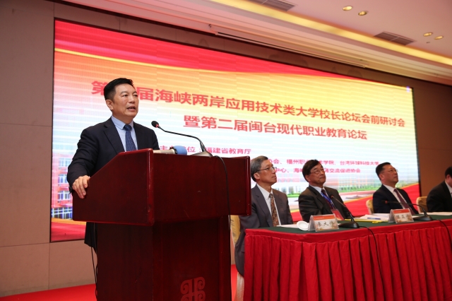 為進(jìn)一步加大海峽兩岸職業(yè)教育的交流與合作,建立海峽兩岸職業(yè)教育合作共贏機(jī)制,加快現(xiàn)代職業(yè)教育體系建設(shè),2017年4月17至18日,由福建省教育廳主辦、福州職業(yè)技術(shù)學(xué)院承辦的“第四屆海峽兩岸應(yīng)用技術(shù)類大學(xué)校長(zhǎng)論壇會(huì)前研討會(huì)暨第二屆閩臺(tái)現(xiàn)代職業(yè)教育論壇”,在福州大飯店順利召開。臺(tái)灣兩岸現(xiàn)代職業(yè)教育協(xié)會(huì)理事長(zhǎng)吳清基博士、臺(tái)灣環(huán)球科級(jí)大學(xué)陳益興校長(zhǎng)、臺(tái)灣健行科技大學(xué)李大偉校長(zhǎng)等一行15名嘉賓參加,省教育廳陳國(guó)龍副廳長(zhǎng)蒞臨論壇并致辭。參加論壇的還有福建省普通本科高校向應(yīng)用型轉(zhuǎn)變?cè)圏c(diǎn)項(xiàng)目名單校、“福建省示范校現(xiàn)代職業(yè)院校建設(shè)工程培養(yǎng)項(xiàng)目”中職、高職校學(xué)(院)的院校長(zhǎng)及專業(yè)帶頭人。李秋斌校長(zhǎng)代表學(xué)校致歡迎詞。