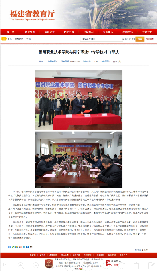 2月2日,福州職業(yè)技術(shù)學(xué)院與周寧職業(yè)中專(zhuān)學(xué)校對(duì)口幫扶簽約儀式在周寧縣舉行。此次對(duì)口幫扶簽約儀式既是貫徹黨的十九大精神和習(xí)近平總書(shū)記“把脫貧攻堅(jiān)作為十三五期間頭等大事和第一民生工程來(lái)抓”的重要指示,也是落實(shí)省委、省政府關(guān)于扶貧攻堅(jiān)工作的部署要求和省委政法委《周寧縣扶貧幫扶工作專(zhuān)題會(huì)議紀(jì)要》精神,以及省教育廳關(guān)于加快推進(jìn)貧困地區(qū)職業(yè)教育精準(zhǔn)扶貧工作的重要舉措。