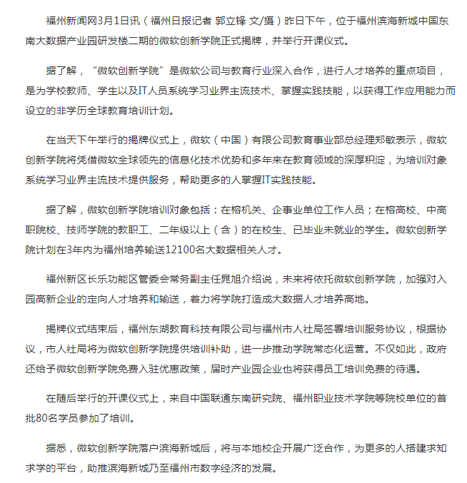 福州新區(qū)長樂功能區(qū)管委會常務(wù)副主任晁旭介紹說,未來將依托微軟創(chuàng)新學(xué)院,加強(qiáng)對入園高新企業(yè)的定向人才培養(yǎng)和輸送,著力將學(xué)院打造成大數(shù)據(jù)人才培養(yǎng)高地。