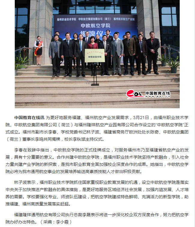 中國(guó)教育在線訊為更好地服務(wù)福建、福州航空產(chǎn)業(yè)發(fā)展需求,3月21日,由福州職業(yè)技術(shù)學(xué)院、中歐航空集團(tuán)有限公司(荷蘭)與福州隆祥航空產(chǎn)業(yè)園有限公司合作設(shè)立的“中歐航空學(xué)院”正式成立。福州市副市長(zhǎng)李春、學(xué)校黨委書記林子波、福建省商務(wù)廳歐洲處處長(zhǎng)陳奇、中歐航空集團(tuán)(荷蘭)董事長(zhǎng)李鳴共同揭牌,校長(zhǎng)李秋斌主持儀式。