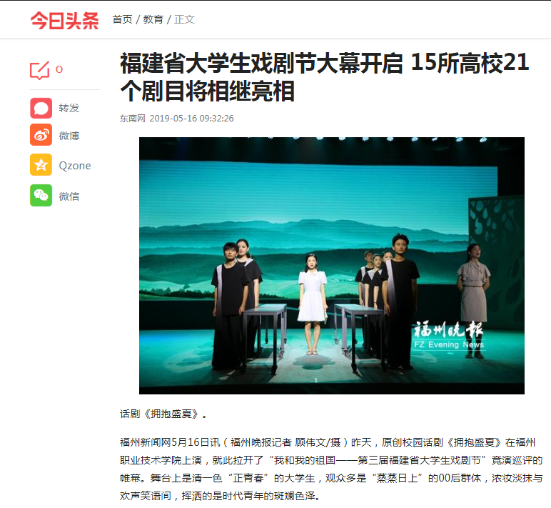 昨天的開場戲《擁抱盛夏》是部以當代職業(yè)技術學院的大學生成長事例為基礎,反映當代工匠人樂觀向上、積極創(chuàng)新的故事,該劇曾參加過去年底的福建省第七屆藝術節(jié),是省藝術節(jié)中唯一一部由非專業(yè)院團選送的節(jié)目。