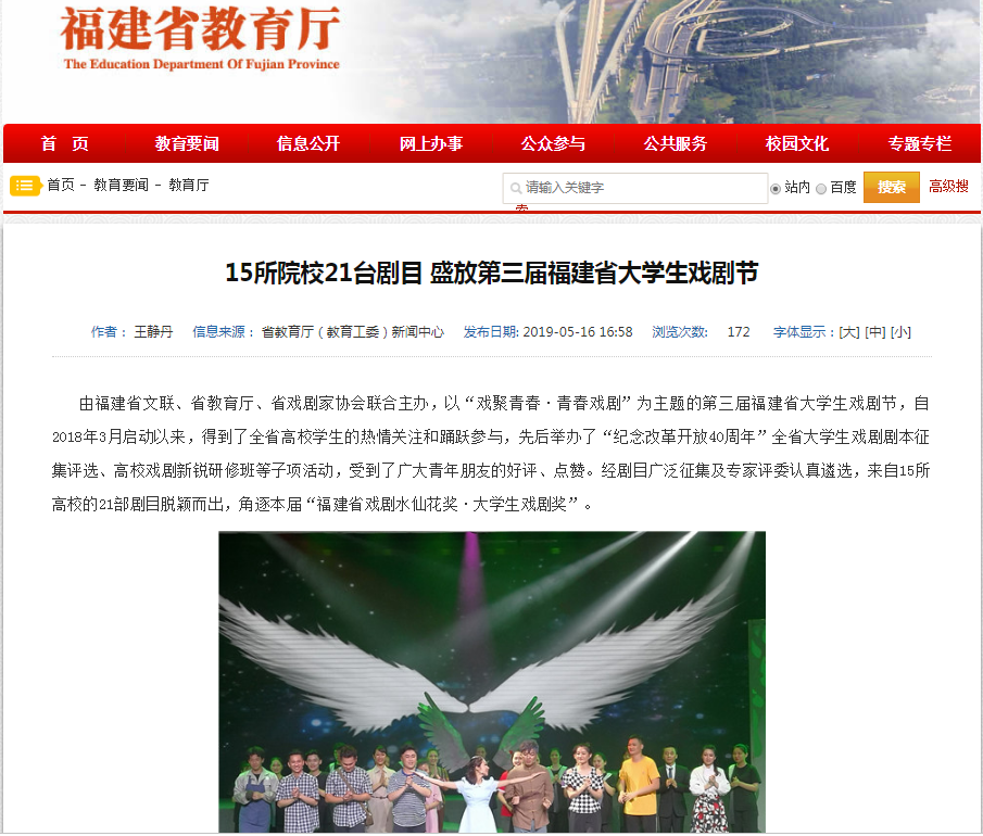 5月15日“我和我的祖國(guó)”第三屆福建省大學(xué)生戲劇節(jié)終評(píng)競(jìng)演的帷幕在福州職業(yè)技術(shù)學(xué)院拉開(kāi),本屆戲劇節(jié)21部劇目將連續(xù)8天依次在福州、泉州、漳州、廈門四地展開(kāi)競(jìng)演巡評(píng)。
