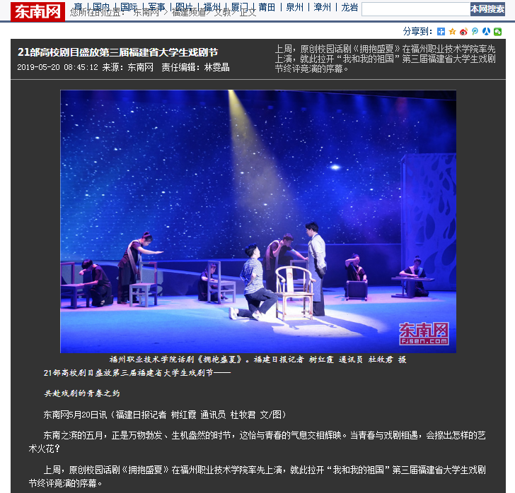 上周,原創(chuàng)校園話劇《擁抱盛夏》在福州職業(yè)技術(shù)學(xué)院率先上演,就此拉開(kāi)“我和我的祖國(guó)”第三屆福建省大學(xué)生戲劇節(jié)終評(píng)競(jìng)演的序幕。