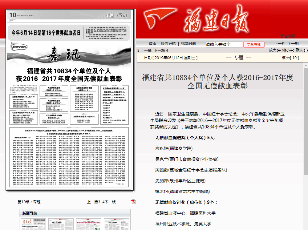 近日,國(guó)家衛(wèi)生健康委、中國(guó)紅十字會(huì)總會(huì)、中央軍委后勤保障部衛(wèi)生局聯(lián)合印發(fā)《關(guān)于表彰2016—2017年度無(wú)償獻(xiàn)血奉獻(xiàn)獎(jiǎng)金獎(jiǎng)等獎(jiǎng)項(xiàng)獲獎(jiǎng)?wù)叩臎Q定》,福建省共10834個(gè)單位及個(gè)人受表彰。
