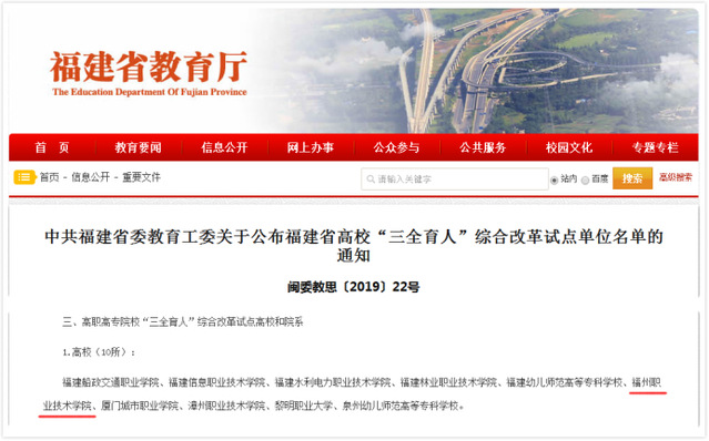 7月4日,中共福建省教育工委正式公布《中共福建省教育工委關(guān)于公布福建省高校“三全育人”綜合改革試點(diǎn)單位名單的通知》(閩委教思〔2019〕22號(hào)),在各地各校申報(bào)的基礎(chǔ)上,經(jīng)專家評(píng)審、結(jié)果公示,遴選產(chǎn)生福建省高校“三全育人”綜合改革試點(diǎn)單位,福州職業(yè)技術(shù)學(xué)院榮登榜單,喜獲高職高專院?!叭恕本C合改革試點(diǎn)高校。