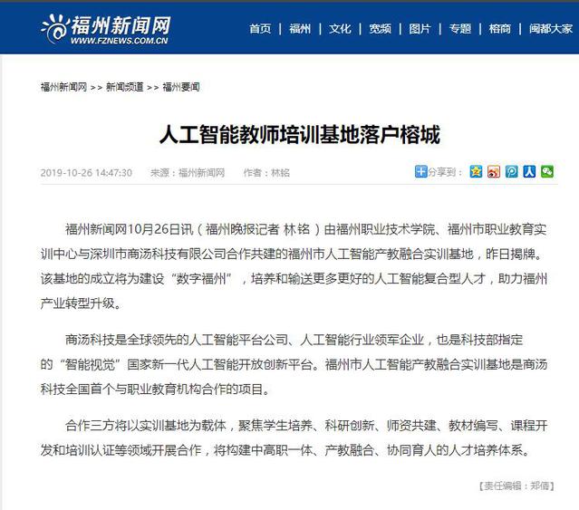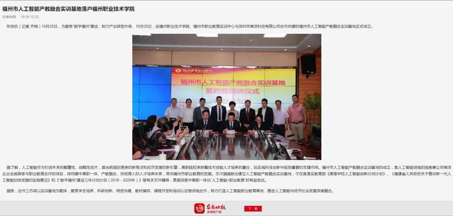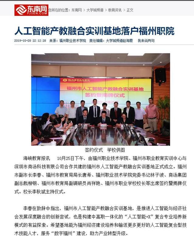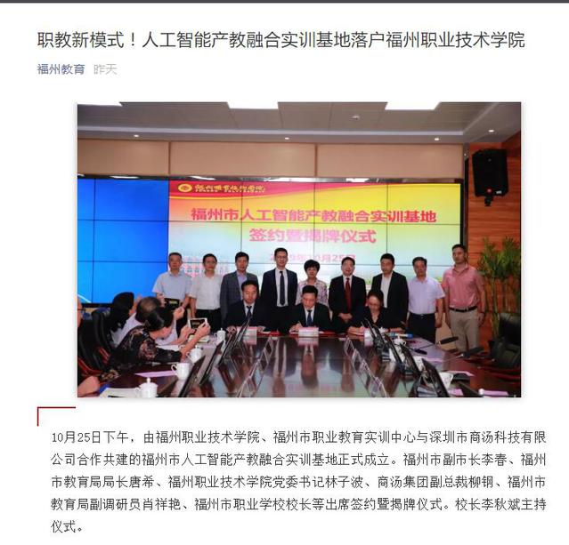 10月25日,福州職業(yè)技術學院、福州市職業(yè)教育實訓中心與深圳市商湯科技有限公司合作共建的福州市人工智能產(chǎn)教融合實訓基地正式成立。