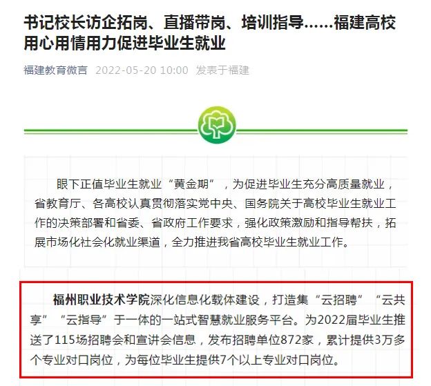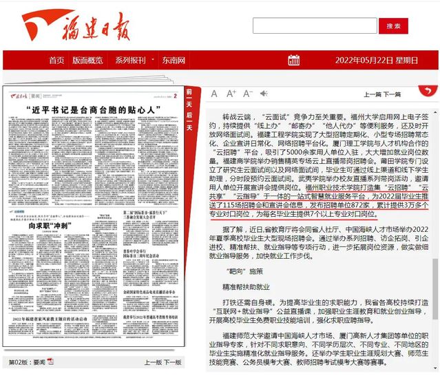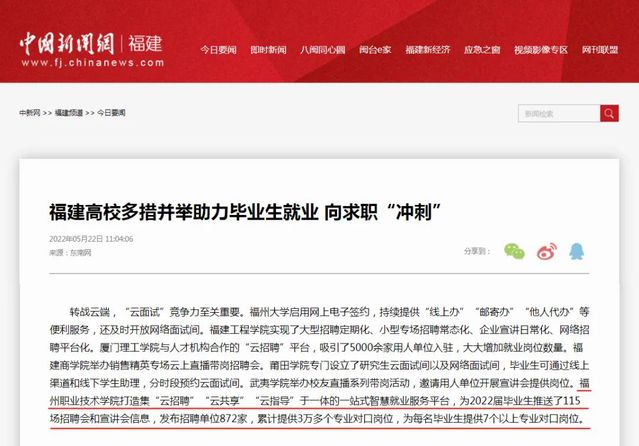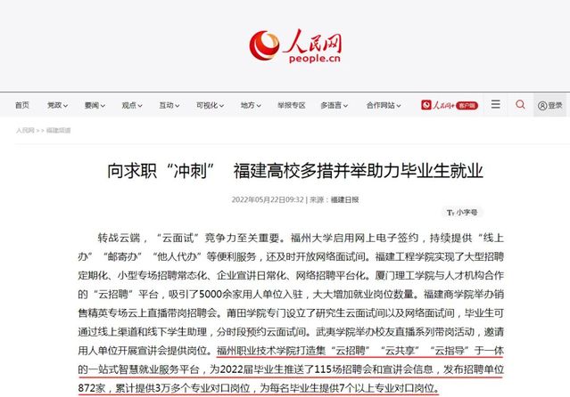 近日,《福建日報(bào)》、中國新聞網(wǎng)、人民網(wǎng)、鳳凰網(wǎng)、東南網(wǎng)、福建教育微言、福州新聞網(wǎng)等多家主流媒體以《福建高校多措并舉助力畢業(yè)生就業(yè) 向求職“沖刺”》為題對福建高校用心用情用力促進(jìn)畢業(yè)生就業(yè)進(jìn)行專題報(bào)道,我?!吧罨畔⒒d體建設(shè),打造集云招聘、云共享、云指導(dǎo)于一體的一站式智慧就業(yè)服務(wù)平臺(tái)”等經(jīng)驗(yàn)做法受到媒體關(guān)注。以下請看報(bào)道節(jié)選,掃描二維碼可收看原文。