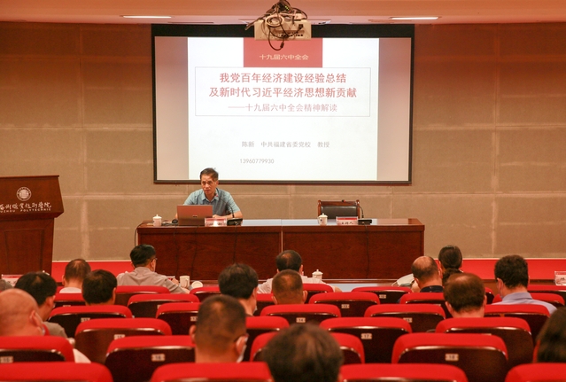 6月22日,我校舉辦校黨委理論學(xué)習(xí)中心組暨學(xué)習(xí)貫徹黨的十九屆六中全會精神集中輪訓(xùn)專題輔導(dǎo)講座,邀請福建省思政課特聘教授、福建省委黨校、省行政學(xué)院經(jīng)濟(jì)學(xué)教研部副主任陳新教授作《我黨百年經(jīng)濟(jì)建設(shè)經(jīng)驗(yàn)總結(jié)及習(xí)近平經(jīng)濟(jì)思想新貢獻(xiàn)》報(bào)告。校黨委書記林子波、校長李秋斌,副校長張?zhí)m英、校紀(jì)委書記陳偉,全體副科級及以上干部、思政課專職教師參加活動?;顒佑尚|h委副書記沈錦華主持。