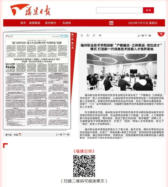 11月17日,《福建日?qǐng)?bào)》以《福州職業(yè)技術(shù)學(xué)院創(chuàng)新“產(chǎn)教融合·立體推進(jìn)·崗位成才”模式 打造新一代信息技術(shù)技能人才培養(yǎng)高地》為題報(bào)道了我校軟件技術(shù)專業(yè)群人才培養(yǎng)創(chuàng)新模式探索與實(shí)踐。