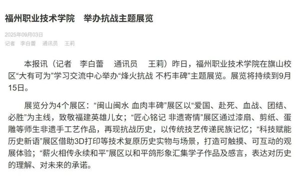 為銘記歷史、緬懷先烈、珍愛和平、開創(chuàng)未來,學(xué)校精心組織開展中國人民抗日戰(zhàn)爭暨世界反法西斯戰(zhàn)爭勝利80周年系列紀(jì)念活動。一是強化思想引領(lǐng),實現(xiàn)全員覆蓋。采用“1個主會場+N個分會場”模式,組織師生收看紀(jì)念大會直播,并開展“開學(xué)思政第一課”,實現(xiàn)學(xué)習(xí)教育全覆蓋。二是創(chuàng)新載體形式,增強育人實效。依托“大有可為”學(xué)習(xí)交流中心舉辦“烽火抗戰(zhàn) 不朽豐碑”主題展覽,展出珍貴史料及師生作品50余件,引導(dǎo)大家從八閩烈士的英勇事跡中汲取前進力量。三是豐富活動內(nèi)涵,深化情感認(rèn)同。組織開展主題快閃合唱、紅色經(jīng)典誦讀、“光影紀(jì)史”觀影、座談交流等系列活動10余場,讓師生在沉浸體驗中傳承紅色基因、弘揚偉大抗戰(zhàn)精神。