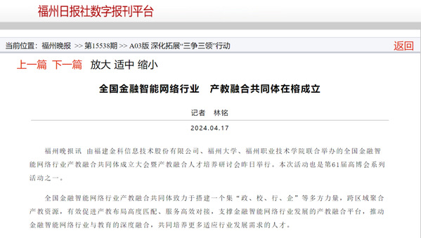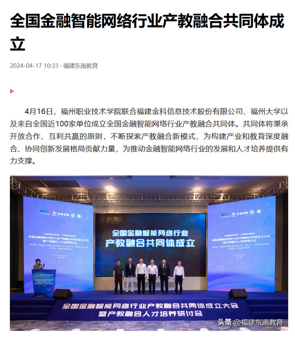 近日,光明日報、福建省教育電視臺、福州廣播電視臺、福建東南教育、福州晚報等多家主流媒體對我校牽頭成立全國金融智能網(wǎng)絡(luò)行業(yè)產(chǎn)教融合共同體進行專題報道。
