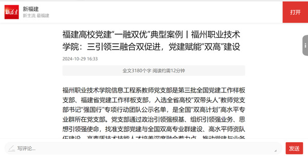 近日,福建日報移動端新福建專題報道我校入選的全省高校“一融雙優(yōu)”基層黨建工作模式典型案例《三引領(lǐng)三融合三促進,黨建賦能雙高建設(shè)》。
