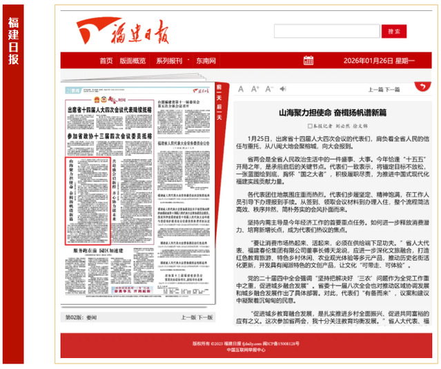 2026年1月27日至1月31日,福建省兩會(huì)在福州順利召開(kāi)。我校黨委書(shū)記王建生,商學(xué)院教授、民革黨員蘭紹清作為省人大代表出席會(huì)議。會(huì)議期間,他們認(rèn)真履行代表職責(zé),圍繞政府工作報(bào)告和全省發(fā)展大局,積極關(guān)注教育強(qiáng)國(guó)、科技強(qiáng)省、人才強(qiáng)省的戰(zhàn)略部署,提出盡快制定出臺(tái)《福建省產(chǎn)教融合促進(jìn)條例》等建議,展現(xiàn)了學(xué)校扎根區(qū)域、服務(wù)發(fā)展,致力于推動(dòng)現(xiàn)代職業(yè)教育高質(zhì)量發(fā)展的堅(jiān)定決心,為譜寫(xiě)中國(guó)式現(xiàn)代化福建篇章貢獻(xiàn)了職教力量。