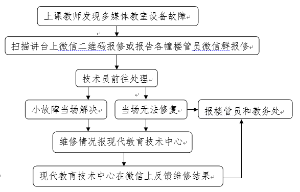 為了不斷完善多媒體教室管理,提高設(shè)備使用率,結(jié)合學(xué)校實(shí)際情況,教師在發(fā)現(xiàn)公共多媒體教室設(shè)備出現(xiàn)故障時(shí),可以通過以下方式報(bào)修。具體流程如下: