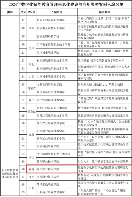 近日,教育部教育管理信息中心公布了《2024年數(shù)字化賦能教育管理信息化建設(shè)與應(yīng)用典型案例》入編名單,我校《教育數(shù)字化轉(zhuǎn)型下的高校數(shù)據(jù)治理研究與實(shí)踐》案例成功入選,是福建省唯一入編的高職院校案例。