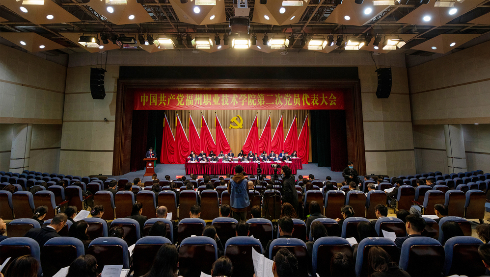 會(huì)場(chǎng)氣氛莊重?zé)崃?。主席臺(tái)上方懸掛著“中國(guó)共產(chǎn)黨福州職業(yè)技術(shù)學(xué)院第二次黨員代表大會(huì)”的會(huì)標(biāo),帷幕正中懸掛的黨徽熠熠生輝,十面鮮艷的紅旗分列兩側(cè)。會(huì)場(chǎng)后方矗立著“高舉旗幟 凝心聚力 奮勇?tīng)?zhēng)先 為建設(shè)中國(guó)特色高水平職業(yè)強(qiáng)校而不懈奮斗”的主題背景。