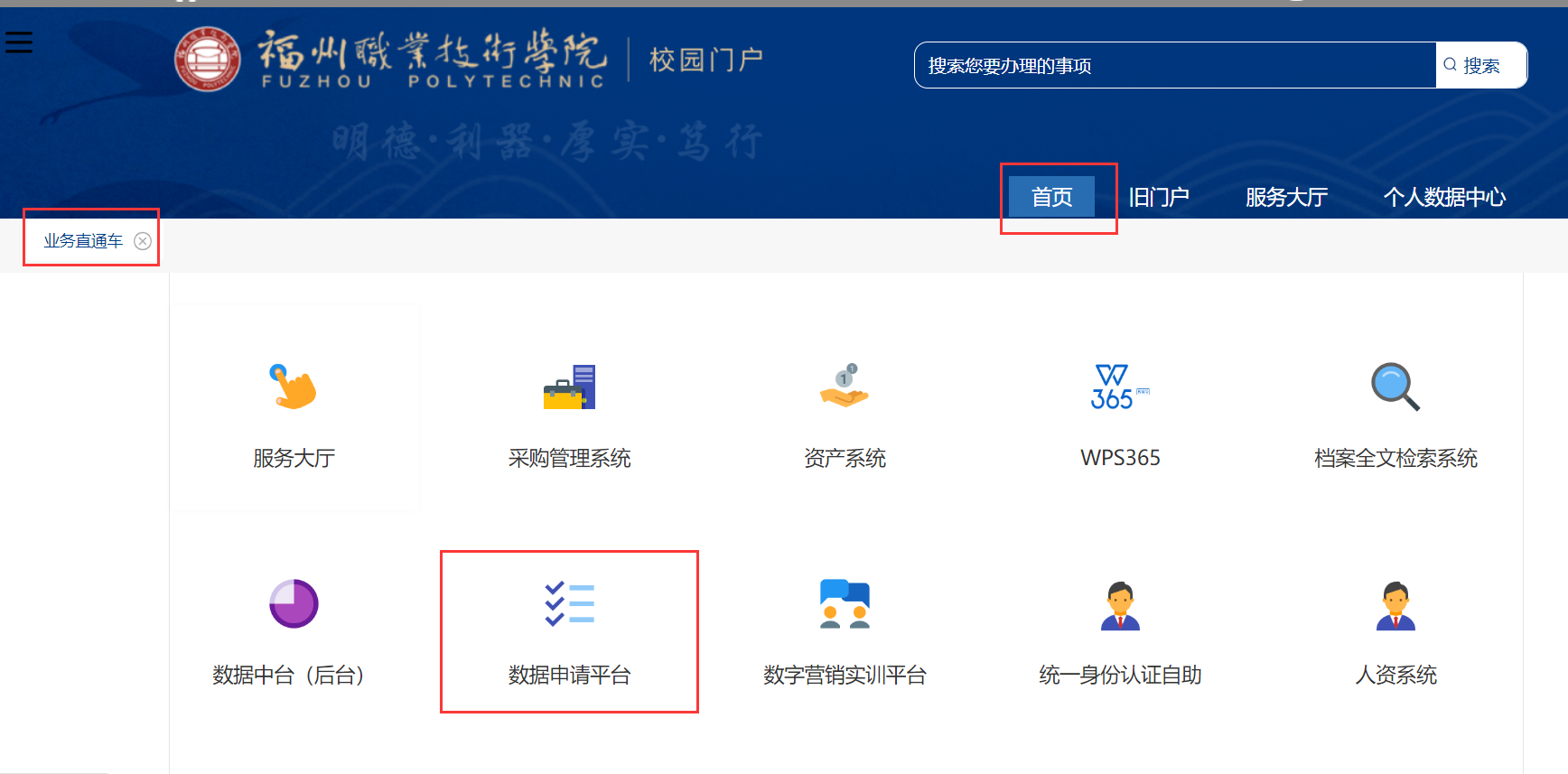 學(xué)校信息門戶—業(yè)務(wù)直通—更多—數(shù)據(jù)申請平臺