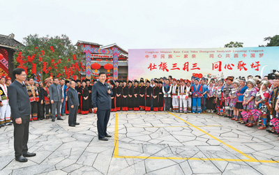 廣西是我國(guó)少數(shù)民族人口最多的自治區(qū)。27日上午,習(xí)近平來到位于南寧市邕江之畔的廣西民族博物館,參觀壯族文化展。博物館外,三月三“歌圩節(jié)”壯族對(duì)歌等民族文化活動(dòng)正在這里集中展示。習(xí)近平強(qiáng)調(diào),廣西是全國(guó)民族團(tuán)結(jié)進(jìn)步示范區(qū),要繼續(xù)發(fā)揮好示范帶動(dòng)作用。各民族共同團(tuán)結(jié)進(jìn)步、共同繁榮發(fā)展是中華民族的生命所在、力量所在、希望所在,在全面建設(shè)社會(huì)主義現(xiàn)代化國(guó)家的新征程上,一個(gè)民族都不能少,各族人民要心手相牽、團(tuán)結(jié)奮進(jìn),共創(chuàng)中華民族的美好未來,共享民族復(fù)興的偉大榮光。