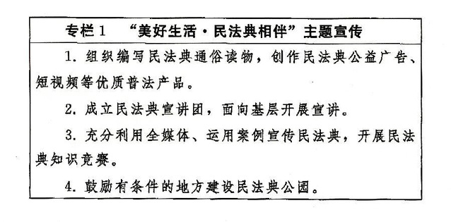 廣泛開(kāi)展民法典普法工作,闡釋好民法典中國(guó)特色社會(huì)主義的特質(zhì),闡釋好民法典關(guān)于民事活動(dòng)平等、自愿、公平、誠(chéng)信等基本原則,闡釋好民法典關(guān)于堅(jiān)持主體平等、保護(hù)財(cái)產(chǎn)權(quán)利、便利交易流轉(zhuǎn)、維護(hù)人格尊嚴(yán)、促進(jìn)家庭和諧、追究侵權(quán)責(zé)任等基本要求,闡釋好民法典一系列新規(guī)定新概念新精神。推動(dòng)各級(jí)黨和國(guó)家機(jī)關(guān)帶頭學(xué)習(xí)宣傳民法典,推動(dòng)領(lǐng)導(dǎo)干部做學(xué)習(xí)、遵守、維護(hù)民法典的表率,提高運(yùn)用民法典維護(hù)人民權(quán)益、化解矛盾糾紛、促進(jìn)社會(huì)和諧穩(wěn)定的能力和水平。把民法典納入國(guó)民教育體系,加強(qiáng)對(duì)青少年民法典教育。以“美好生活·民法典相伴”為主題,組織開(kāi)展民法典主題宣傳,讓民法典走到群眾身邊、走進(jìn)群眾心里。
