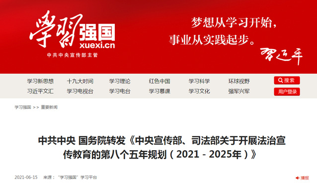 新華社北京6月15日電 近日,中共中央、國(guó)務(wù)院轉(zhuǎn)發(fā)了《中央宣傳部、司法部關(guān)于開(kāi)展法治宣傳教育的第八個(gè)五年規(guī)劃(2021-2025年)》,并發(fā)出通知,要求各地區(qū)各部門(mén)結(jié)合實(shí)際認(rèn)真貫徹落實(shí)。