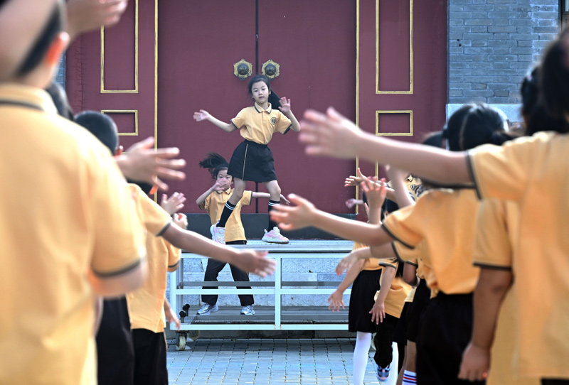 2024年9月2日,北京第二實(shí)驗(yàn)小學(xué)學(xué)生在教室外鍛煉。新華社記者 金良快 攝