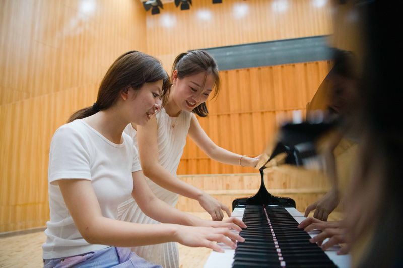 2024年9月7日,在安徽藝術(shù)學(xué)院音樂學(xué)院,患有先天性眼疾的郁曉楠(前)在老師王昕的指導(dǎo)下彈奏鋼琴。作為盲人考生,郁曉楠參加2024年高考,最終圓夢安徽藝術(shù)學(xué)院音樂表演專業(yè)。新華社記者 張端 攝
